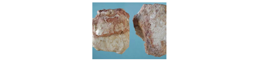 本品多為塊狀集合體。呈不規(guī)則的塊狀。白色、黃白色或淡藍(lán)灰色,有蠟樣光澤。質(zhì)軟,細(xì)膩,手摸有滑潤(rùn)感,無(wú)吸濕性,置水中不崩散。氣微,味淡